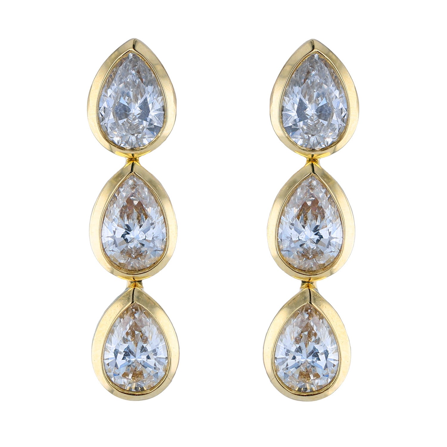 This sparkling pair of diamond drop earrings feature 1.83 carats of pear-shape diamonds that are F to G in color and VVS to VS in clarity. This pair of diamond earrings have been set in 18K yellow gold and have a friction back closure.