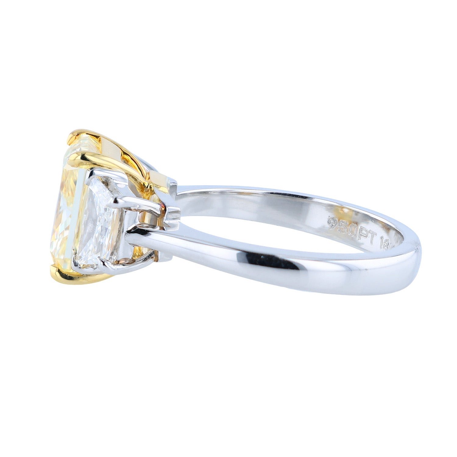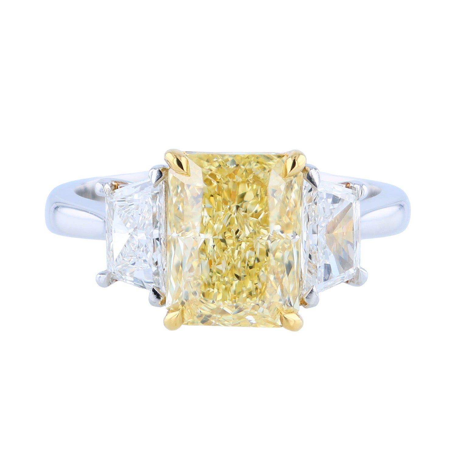 This breathtaking diamond three-stone ring features a 3.01 carat fancy yellow radiant diamond center that has been independently graded by GIA. The fancy yellow radiant has a clarity of VVS2. The GIA certificate number for the center diamond is 6237343294. The side stones measure 0.77 carats of sparkling trapezoid diamonds. This ring has been set in platinum and 18K yellow gold and measures a size 6.