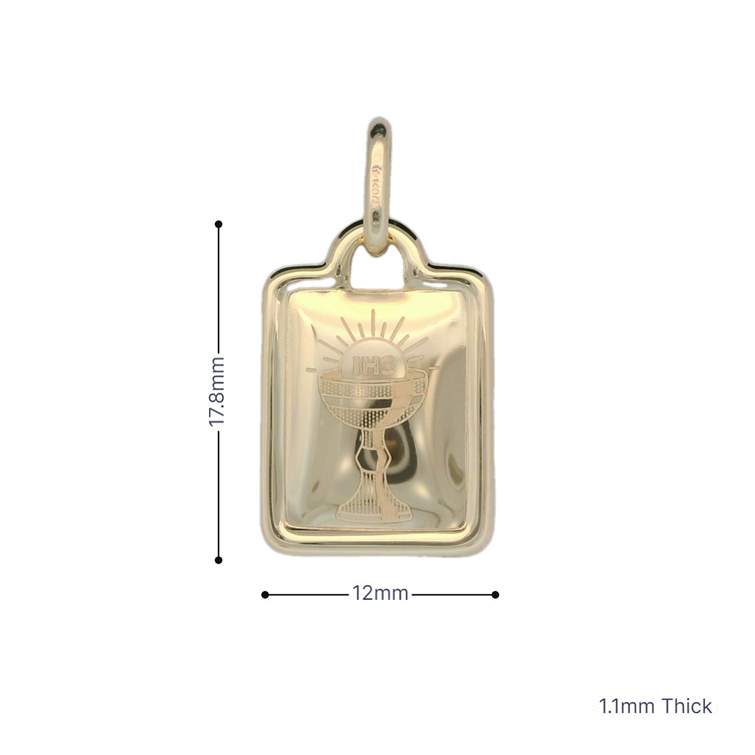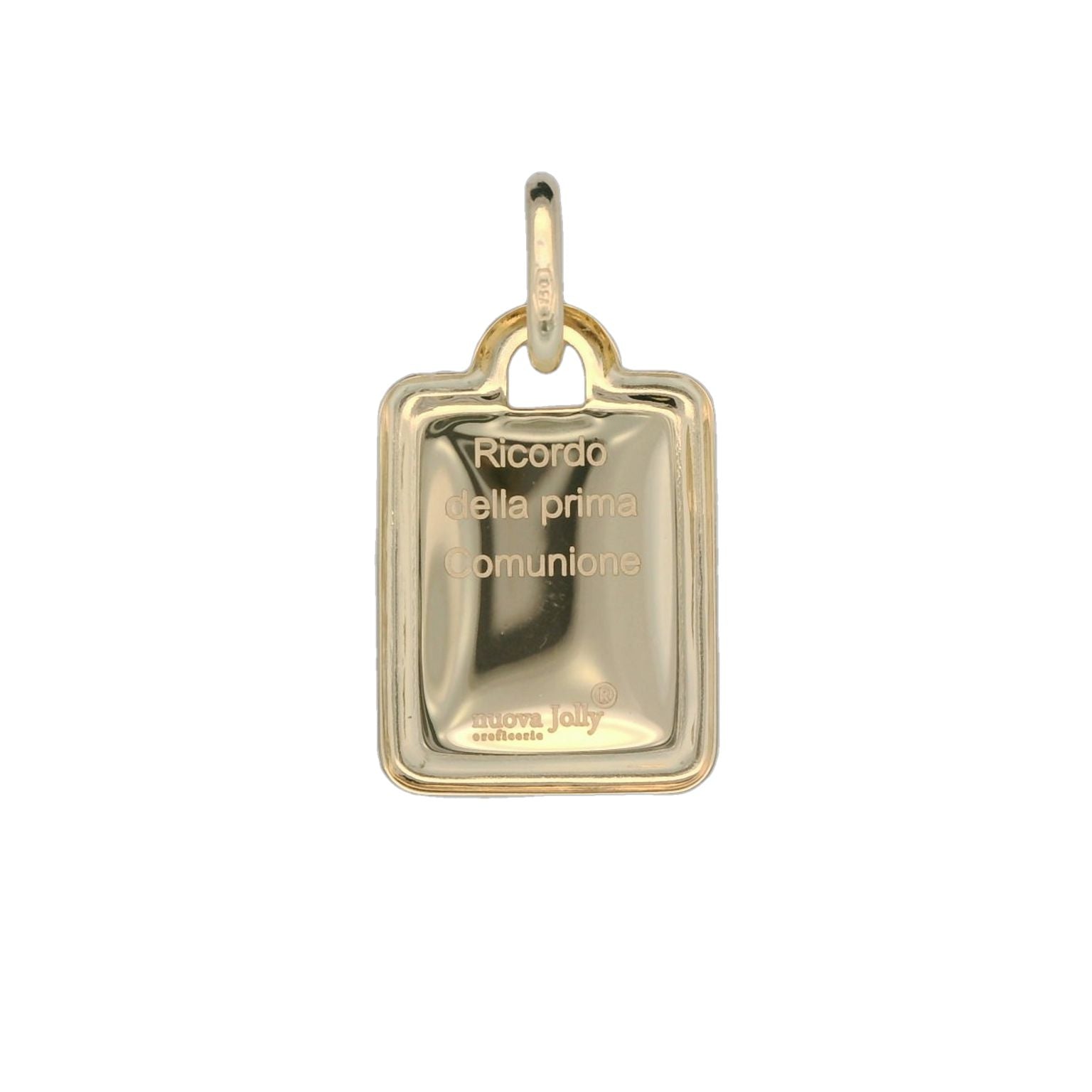 This solid gold pendant is set in 18K yellow gold and is made in Italy. The back of this pendant features an Italian engraving that says 'Ricordo della prima Comunione' which translates to 'Memory of my first Communion' in English.
