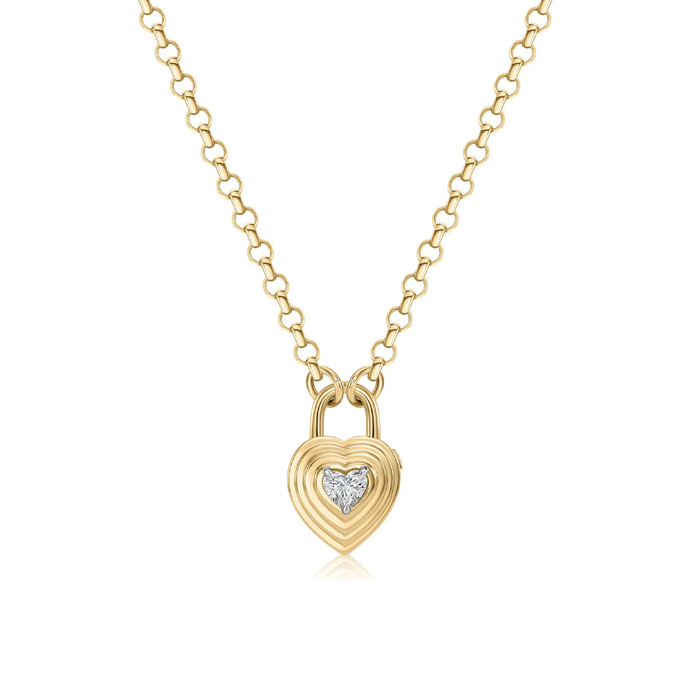The Stories Collection showcases layers of high-polish gold, designed to reflect the unique journey of your life. Like the rings of a tree, each layer tells a story of growth and transformation. This heart-shaped lock necklace opens and closes with a working clasp, holding a heart-cut diamond at its center. A symbol of love, memory, and everything worth keeping close.