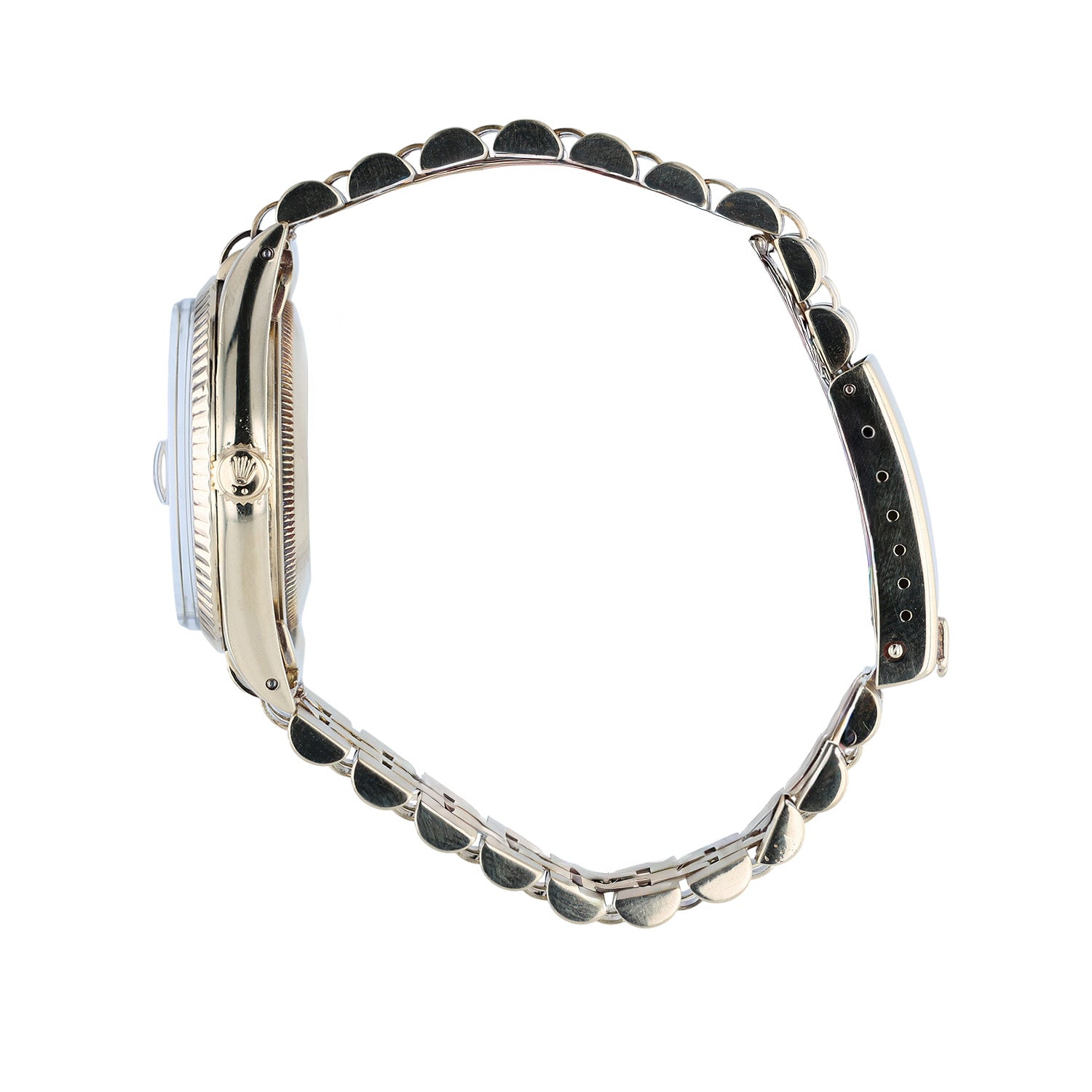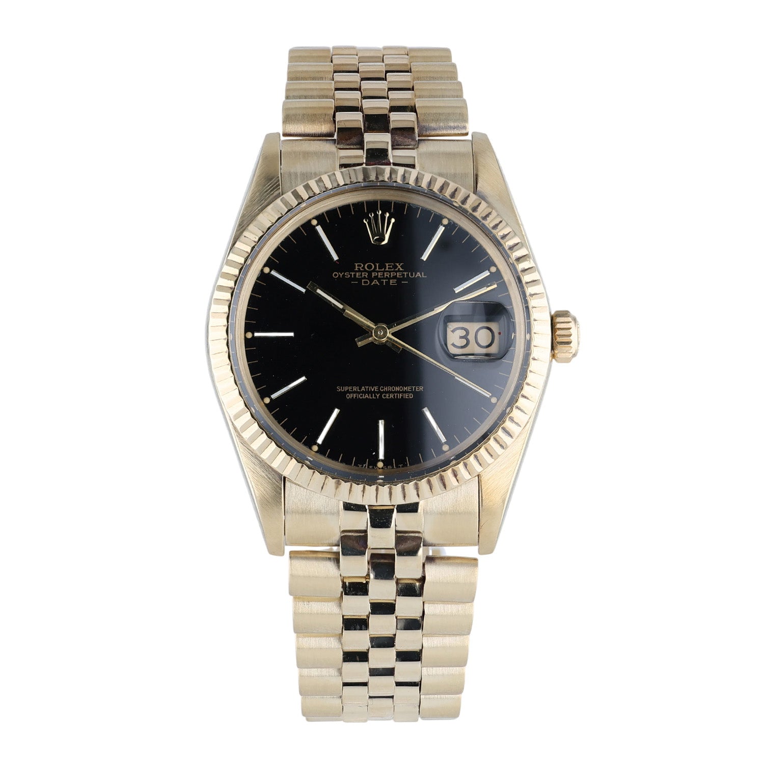 The Pre-owned Rolex Date 15037 offers timeless sophistication in 14k yellow gold, highlighted by a rich black dial that exudes modern elegance. Powered by a precise self-winding movement with a 42-hour power reserve, it blends luxury and performance effortlessly. Its iconic Oyster case ensures dependable water resistance to 100 m/330 ft, while the fluted bezel and refined proportions create a truly distinguished presence on the wrist. A classic statement piece for those who appreciate understated prestige.