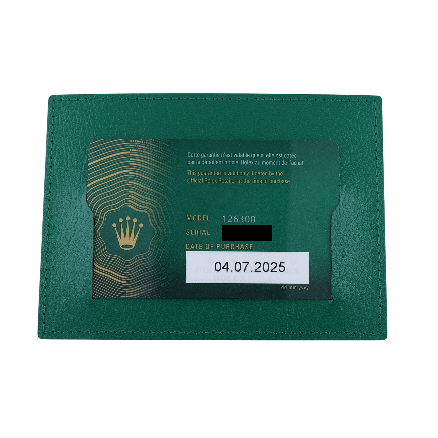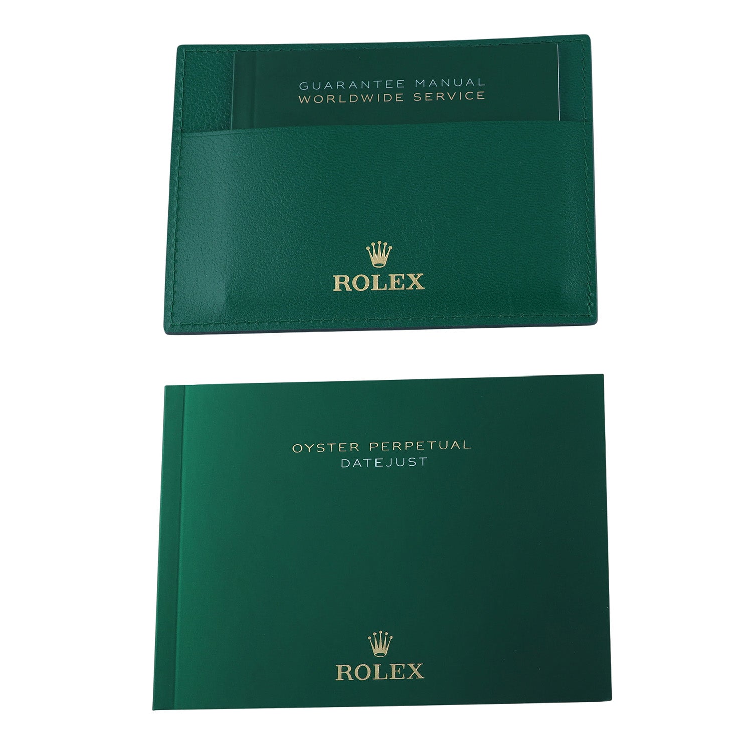 The Pre-Owned Rolex Datejust 41 in stainless steel has a green stick dial with luminous hour markers, a smooth bezel, and an Oyster bracelet with an Oysterclasp and Easylink comfort extension. It runs on the Rolex Caliber 3235 automatic movement with a 70-hour power reserve and is water resistant up to 100m/330 feet. Includes original Rolex box and papers.