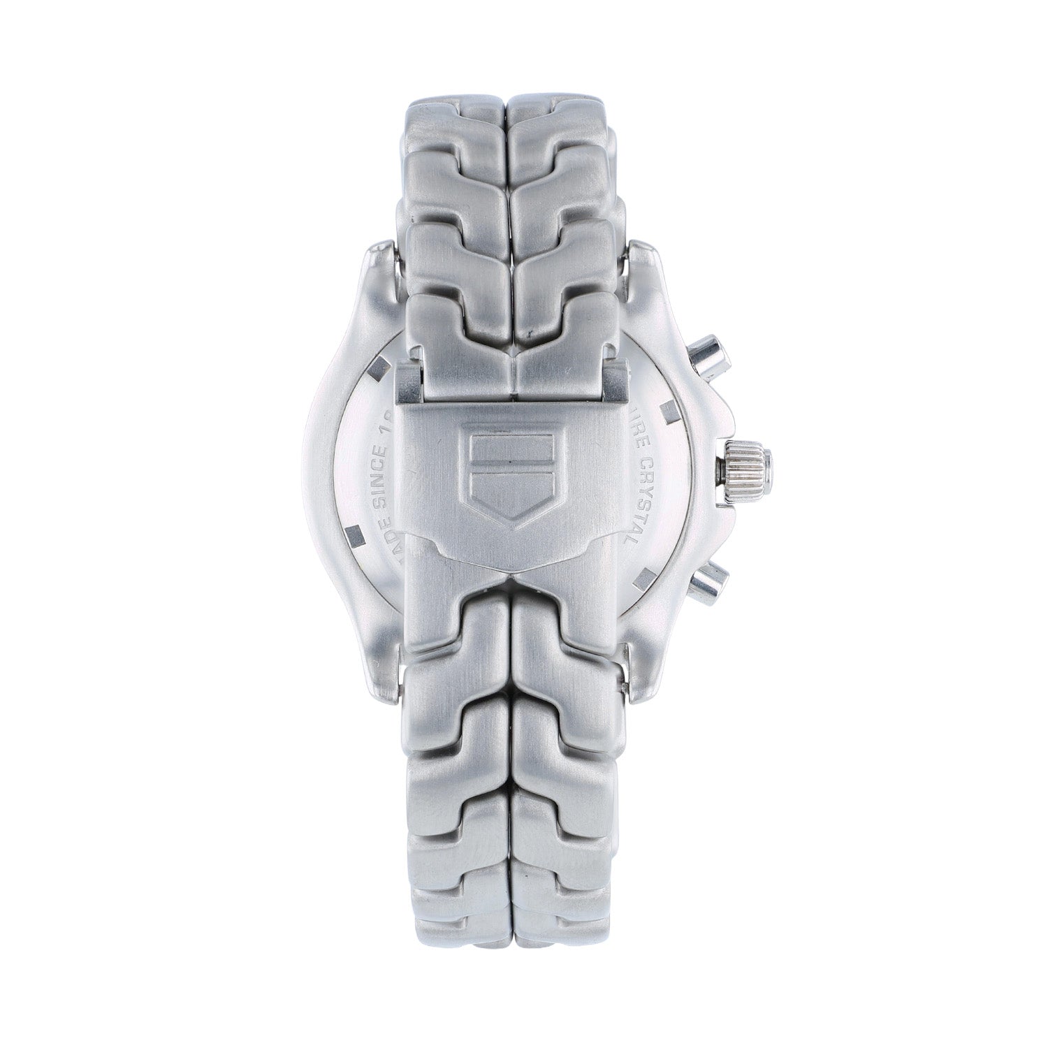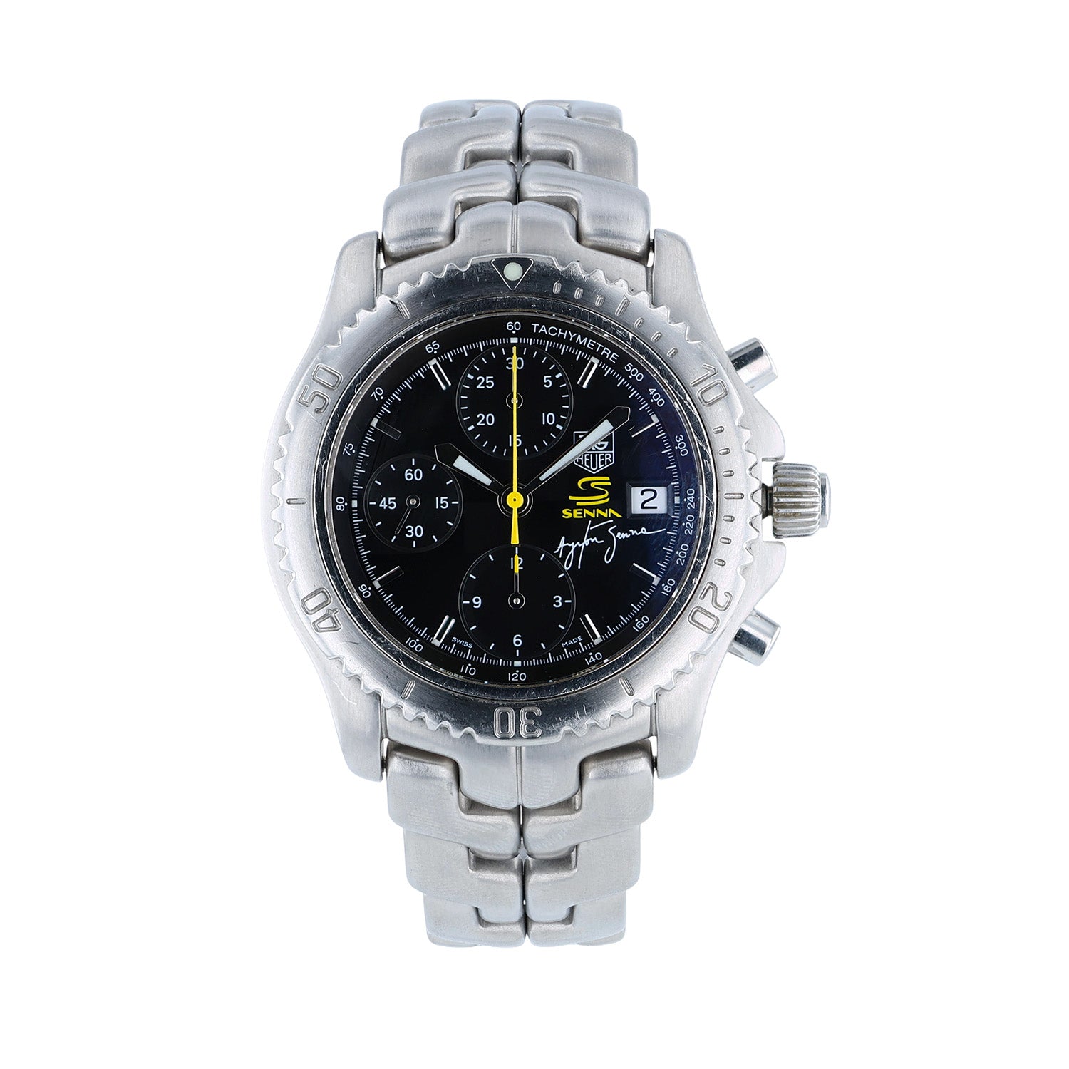 A limited-edition TAG Heuer Link “Ayrton Senna” chronograph with a 41 mm stainless steel case, black dial, three subdials, and an integrated Link bracelet. Powered by an automatic movement with date, sapphire crystal, and water resistance up to 200m/660 feet. Comes with original box and papers, making it a complete collectible piece that blends sporty design with TAG Heuer’s racing heritage.