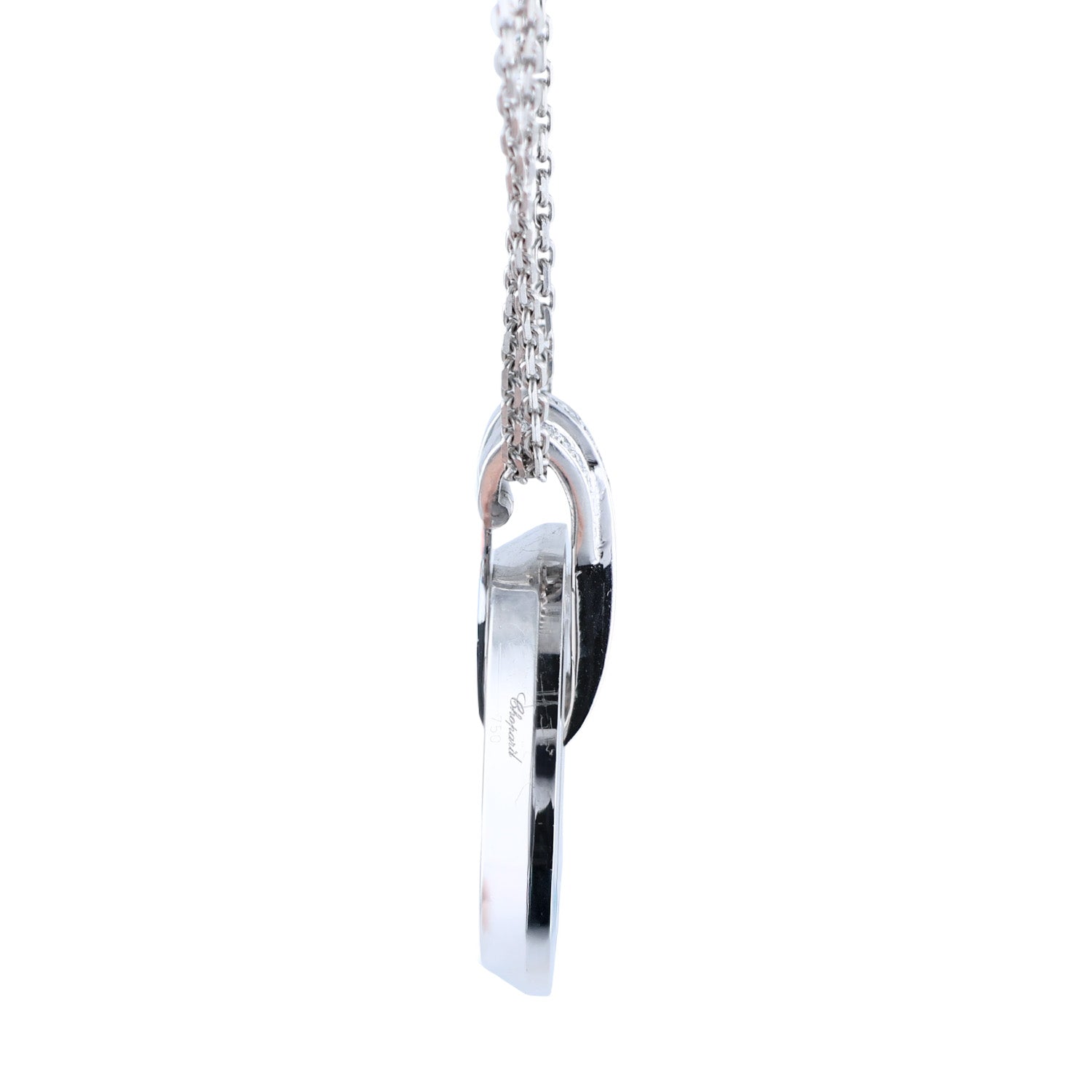 From the Bella Cosa Jewelers estate collection. This pre-owned Chopard diamond necklace is part of the Happy Diamonds collection. This Chopard necklace features 0.47 carats of diamonds that are E to F in color and VVS2 to VS1 in clarity. This Chopard diamond necklace has been set in 18K white gold and measures 16 inches in length. Diamond weights are estimated.