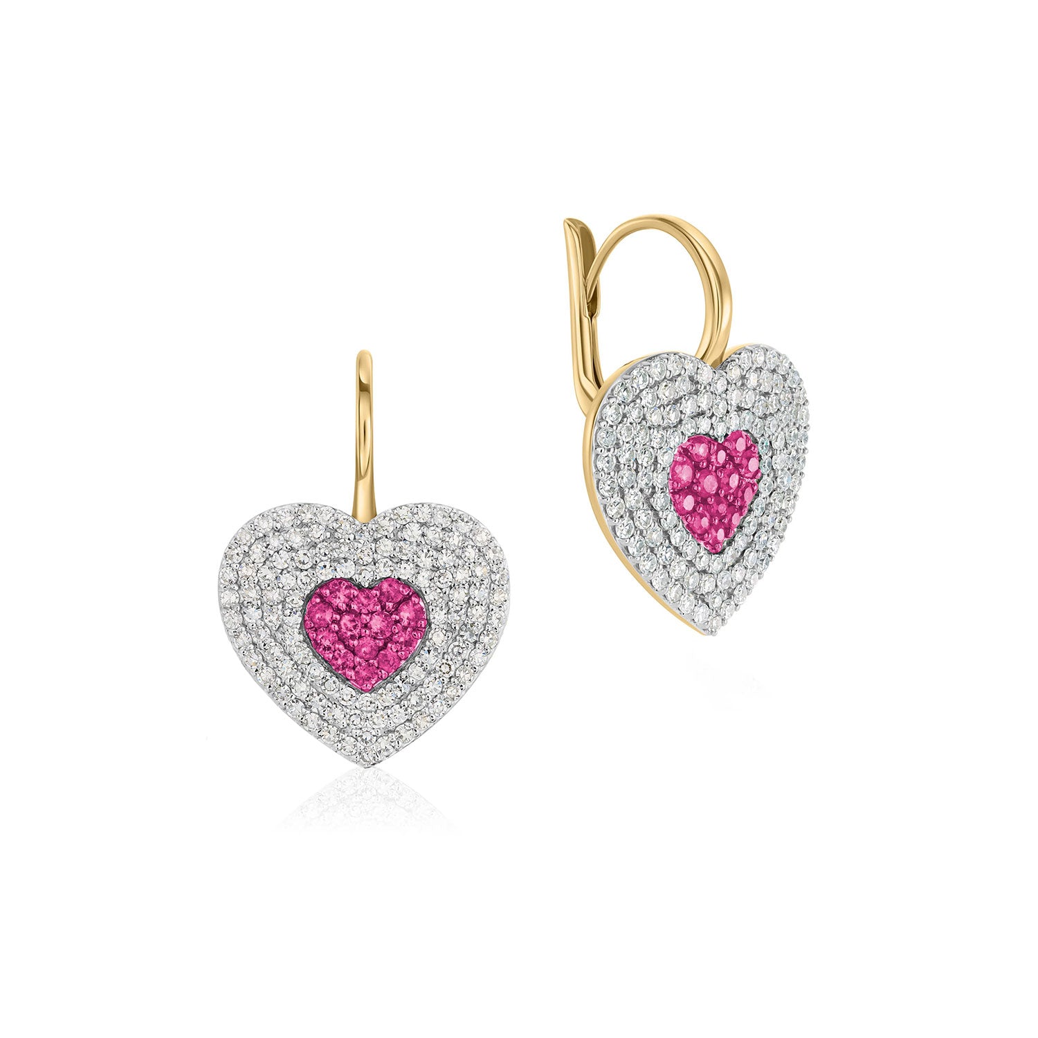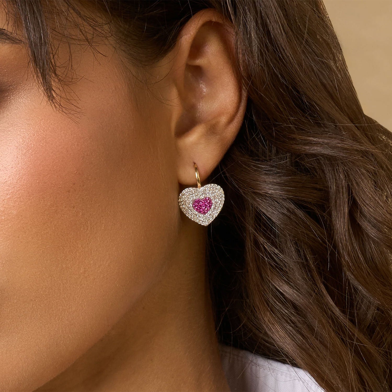 Vibrant pink sapphires meet white diamonds in our signature pave, creating bold heart charms on polished gold huggies. Layered sparkle and rich color catch the light from every angle, bringing a fresh, playful edge to a timeless silhouette.