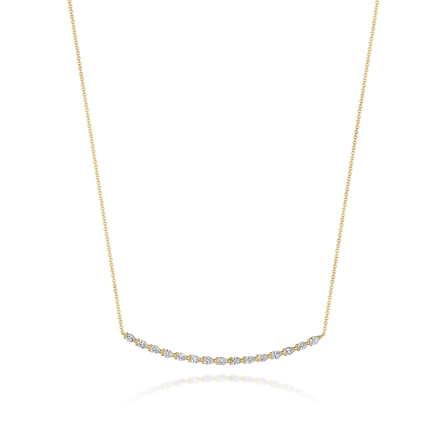 A delicate string of pear cut diamonds hangs from a chain of 18K yellow gold. The silhouette of each stone is embellished with milgrain-accented TACORI Crescents.