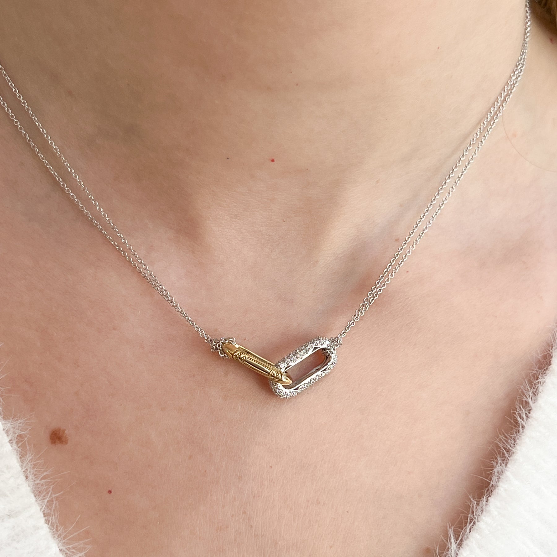 From the TACORI Fine Jewelry Collection, the TACORI 18K Crescent Eclipse Double Link Necklace features a two-tone design in yellow and white gold. It includes a hand-hewn, milgrain-embellished, interconnected link pendant adorned with G-H color, SI1-SI2 clarity round brilliant diamonds totaling 0.49 carats. The necklace is approximately 17 inches in length, with additional jump rings at 15 and 16 inches, and the pendant measures 1.125in x 0.3125in.