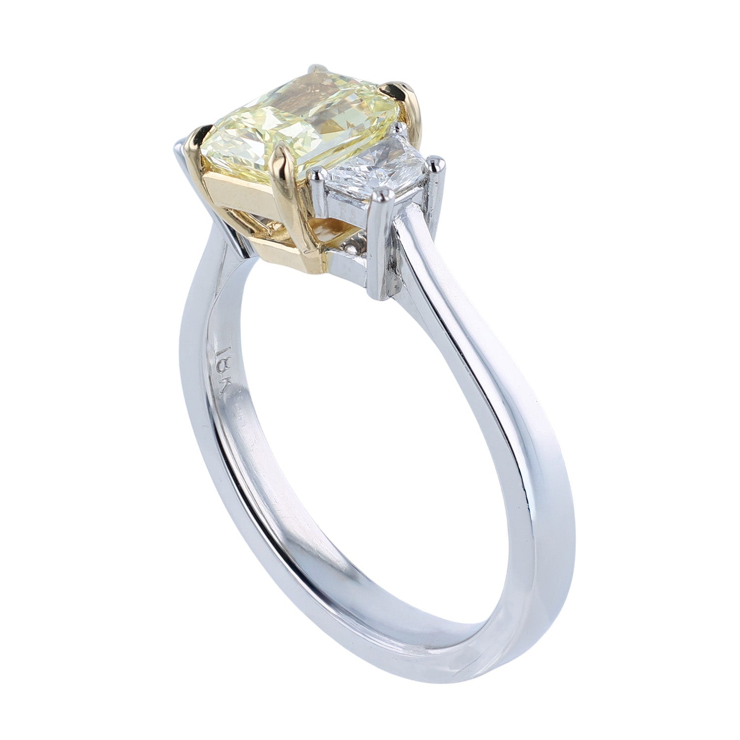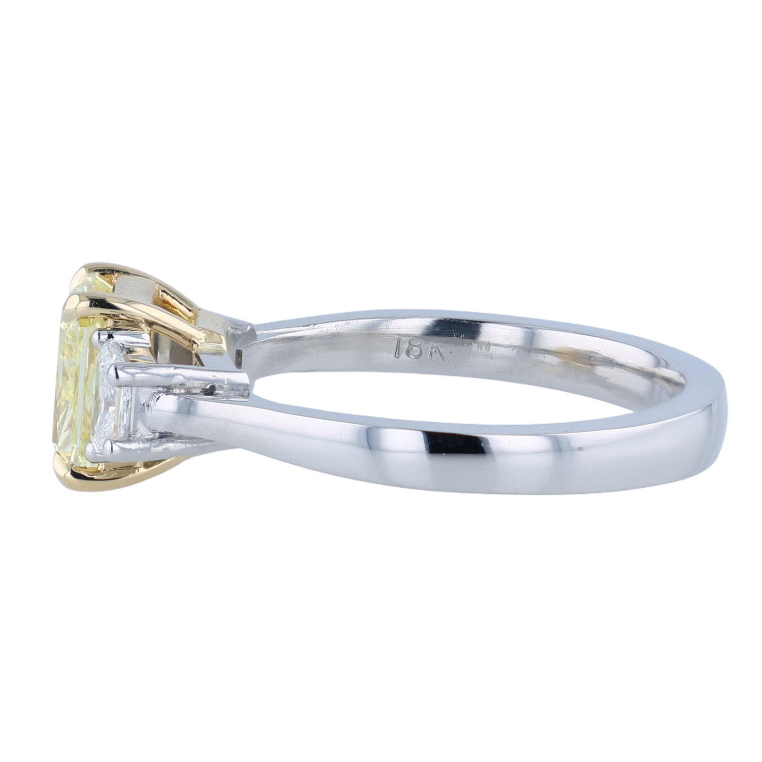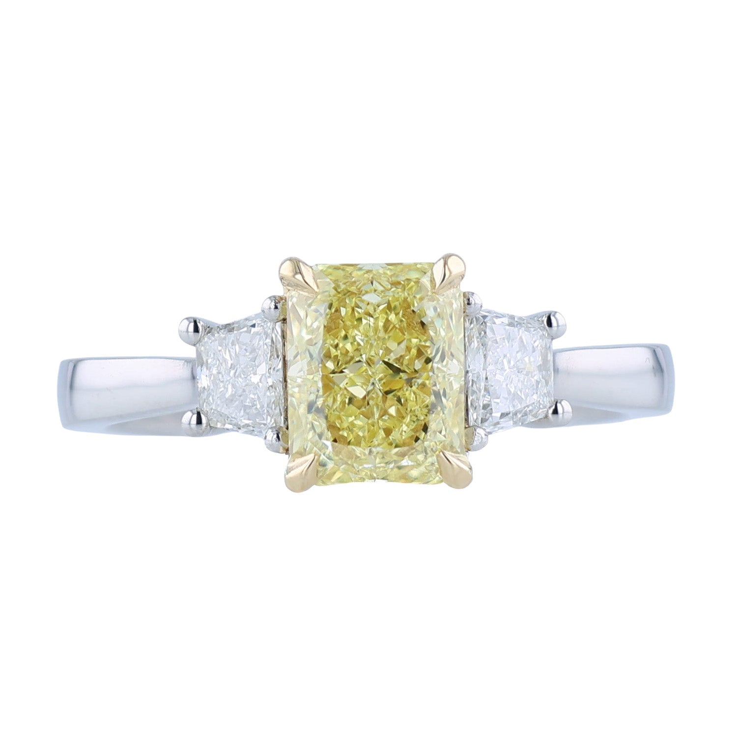 This sparkling diamond three-stone ring has been set in platinum and 18K yellow gold. The center diamond is a fancy intense yellow diamond that is VS2 in clarity. The side diamonds in this ring are 0.37 carats that are G in color and VS1 to VS2 in clarity. This diamond ring measures a size 6.75.