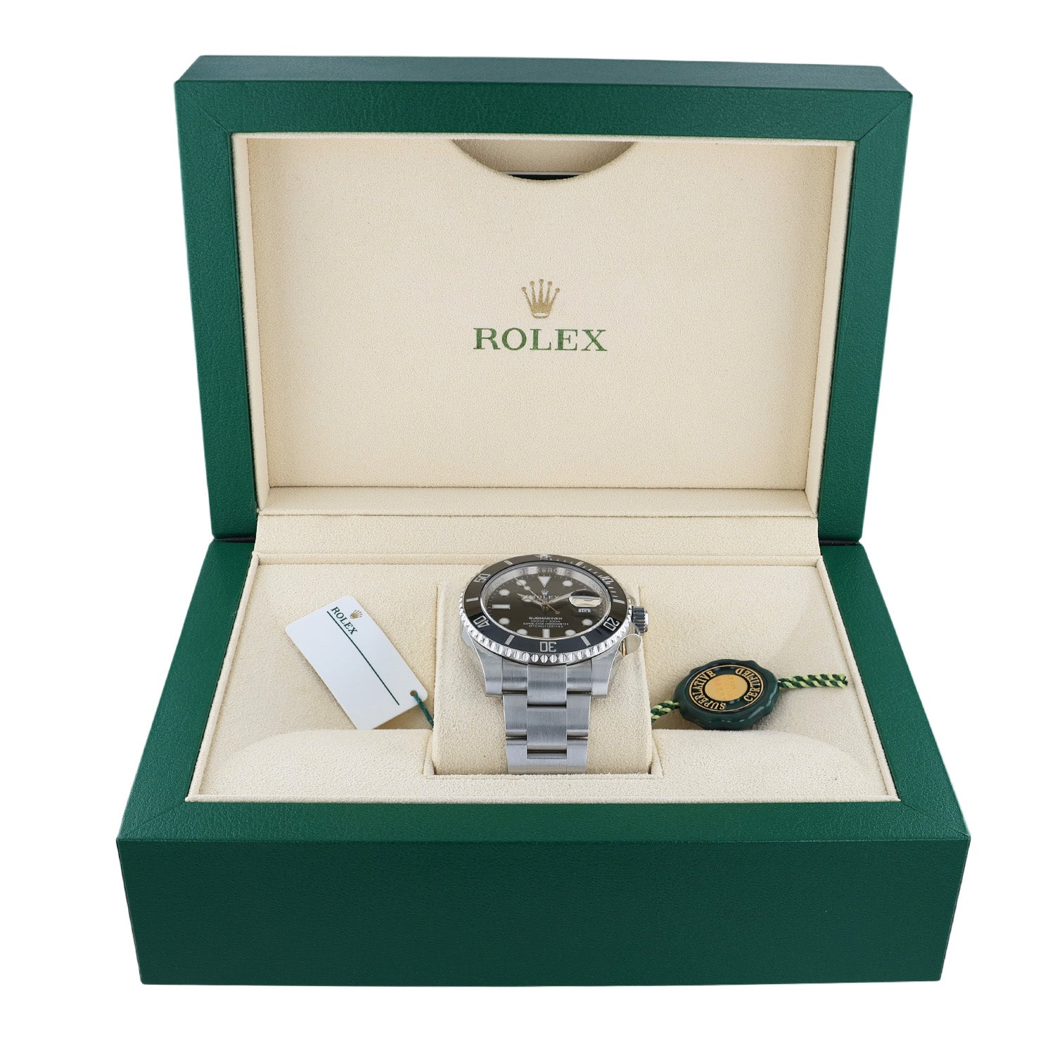 The 40mm Submariner is built in Oystersteel, Rolex’s proprietary 904L stainless steel known for its exceptional corrosion resistance and lasting shine. It comes with a black ceramic bezel and black dial, fitted with a sapphire crystal and Cyclops date window. Powered by the automatic Caliber 3135, it’s water resistant to 300 meters (1,000 feet), making it a true dive watch that’s also perfect for everyday wear. This watch comes with box and papers from 07/2018