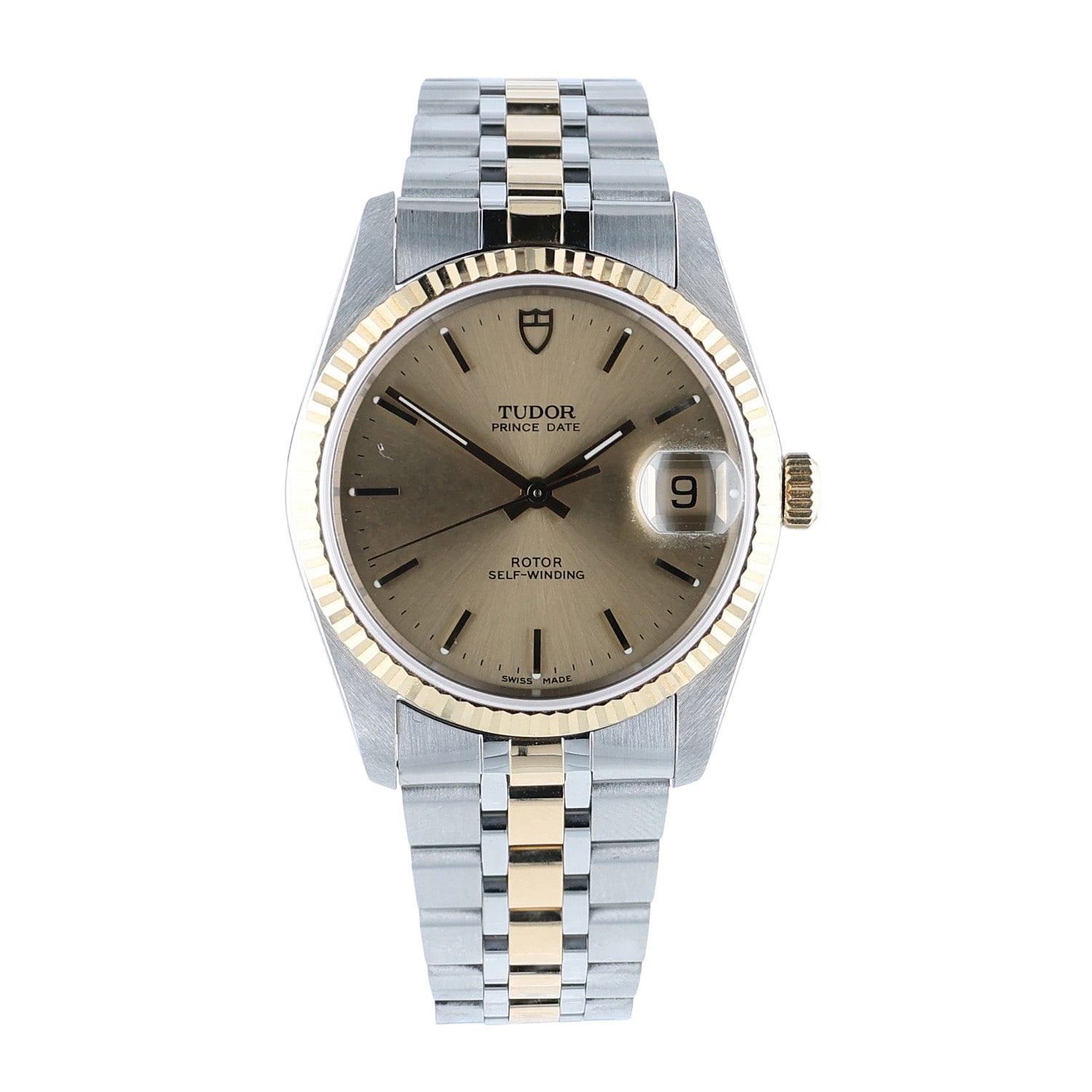 This Tudor Prince Date comes in a stainless steel and 18K yellow gold case with a fluted bezel and a champagne dial. It includes a day and date display, runs on an automatic movement, and is water resistant to 100m/330 feet, combining classic style with reliable performance.