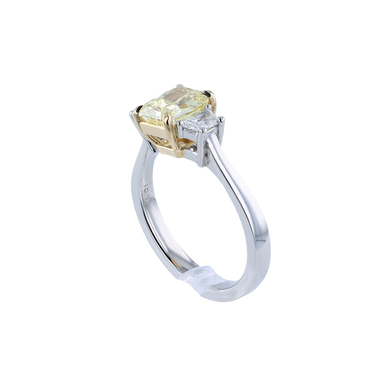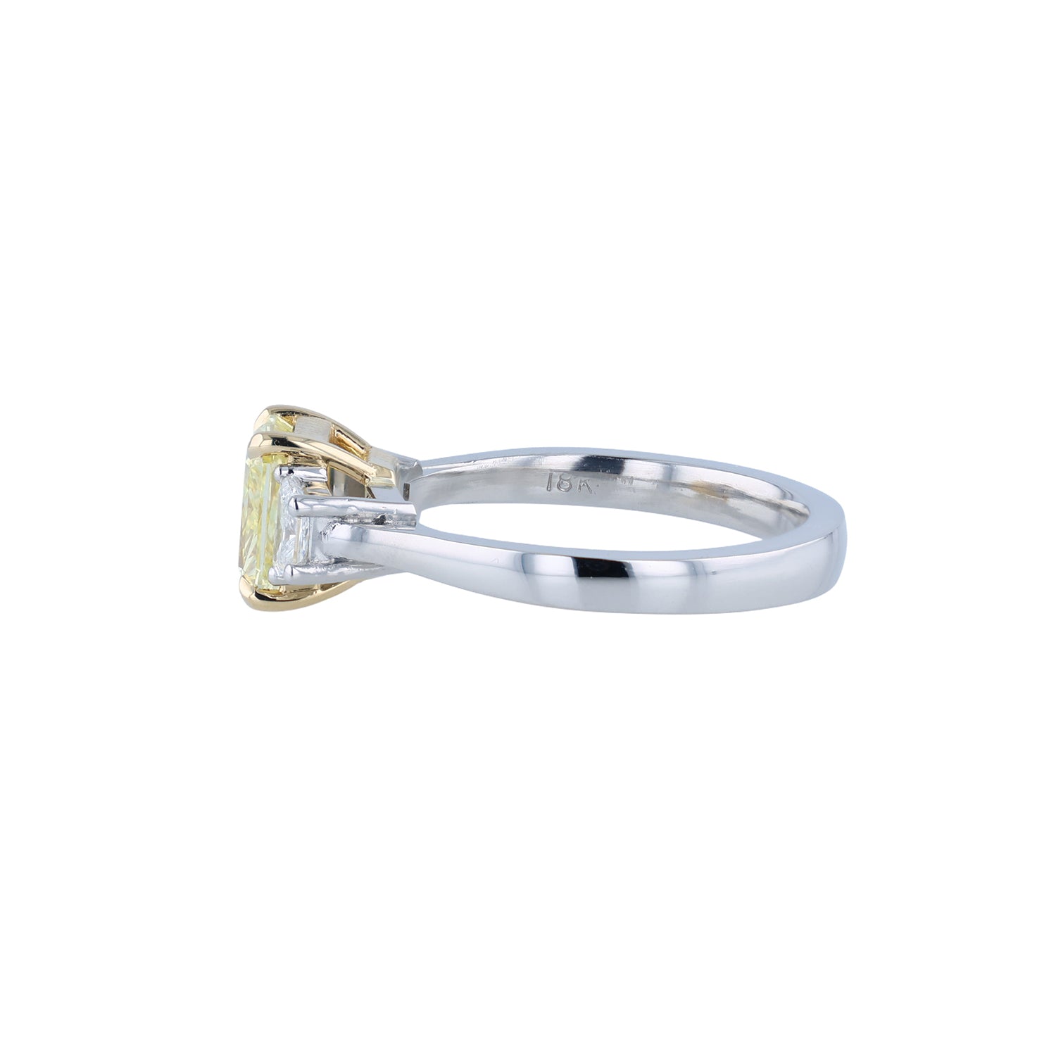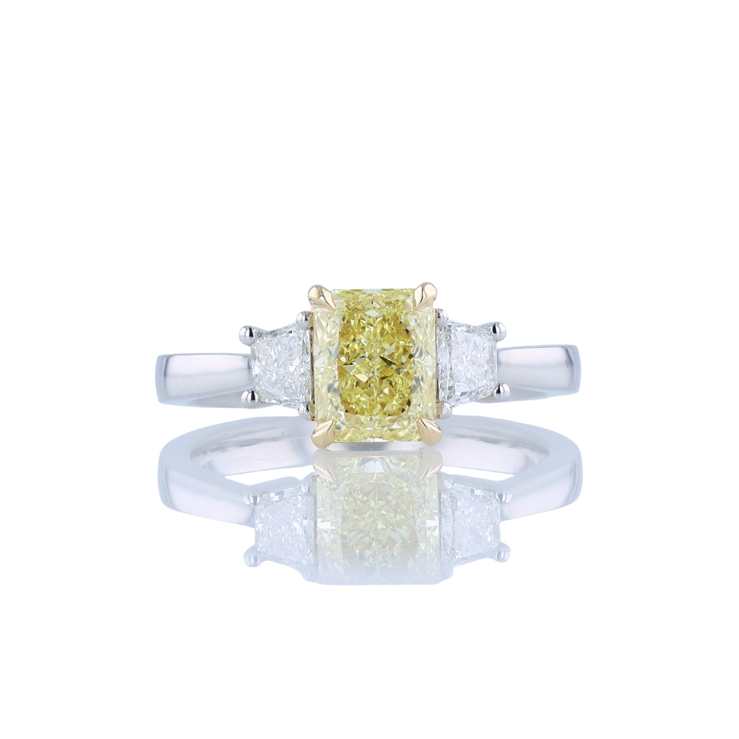 This sparkling diamond three-stone ring has been set in platinum and 18K yellow gold. The center diamond is a fancy intense yellow diamond that is VS2 in clarity. The side diamonds in this ring are 0.37 carats that are G in color and VS1 to VS2 in clarity. This diamond ring measures a size 6.75.