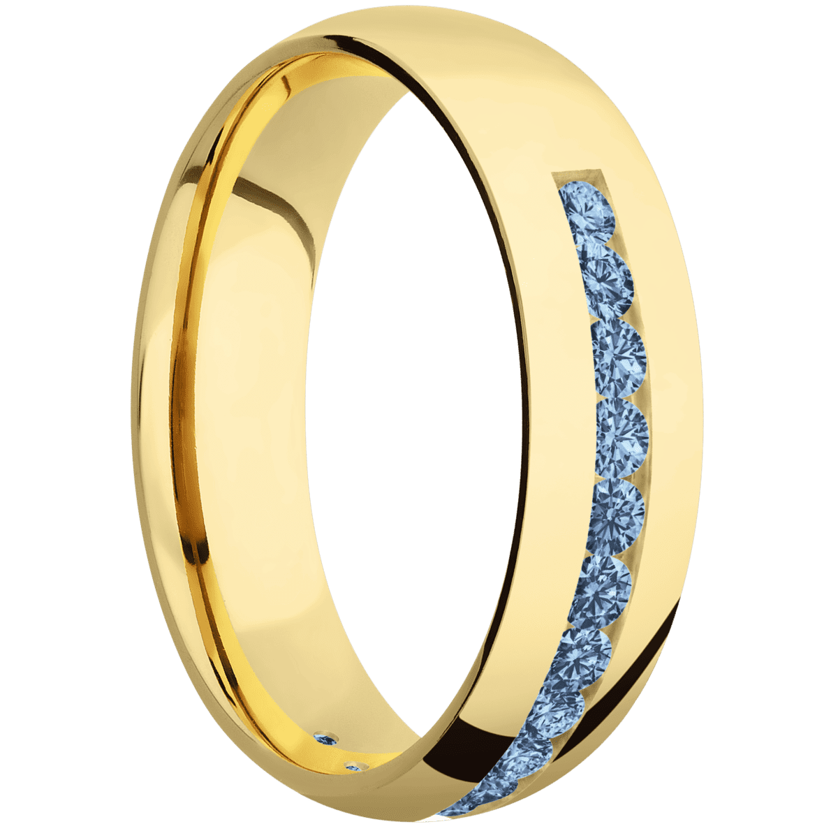 6 mm wide/Domed/18K Yellow Gold band with a Half Eternity arrangement of .05 carat Round Denim Sapphire stones in a Channel setting.