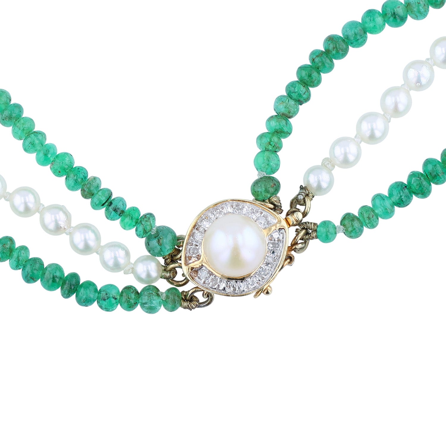 Estate 14K Emerald Pearl and Diamond Triple Strand Necklace