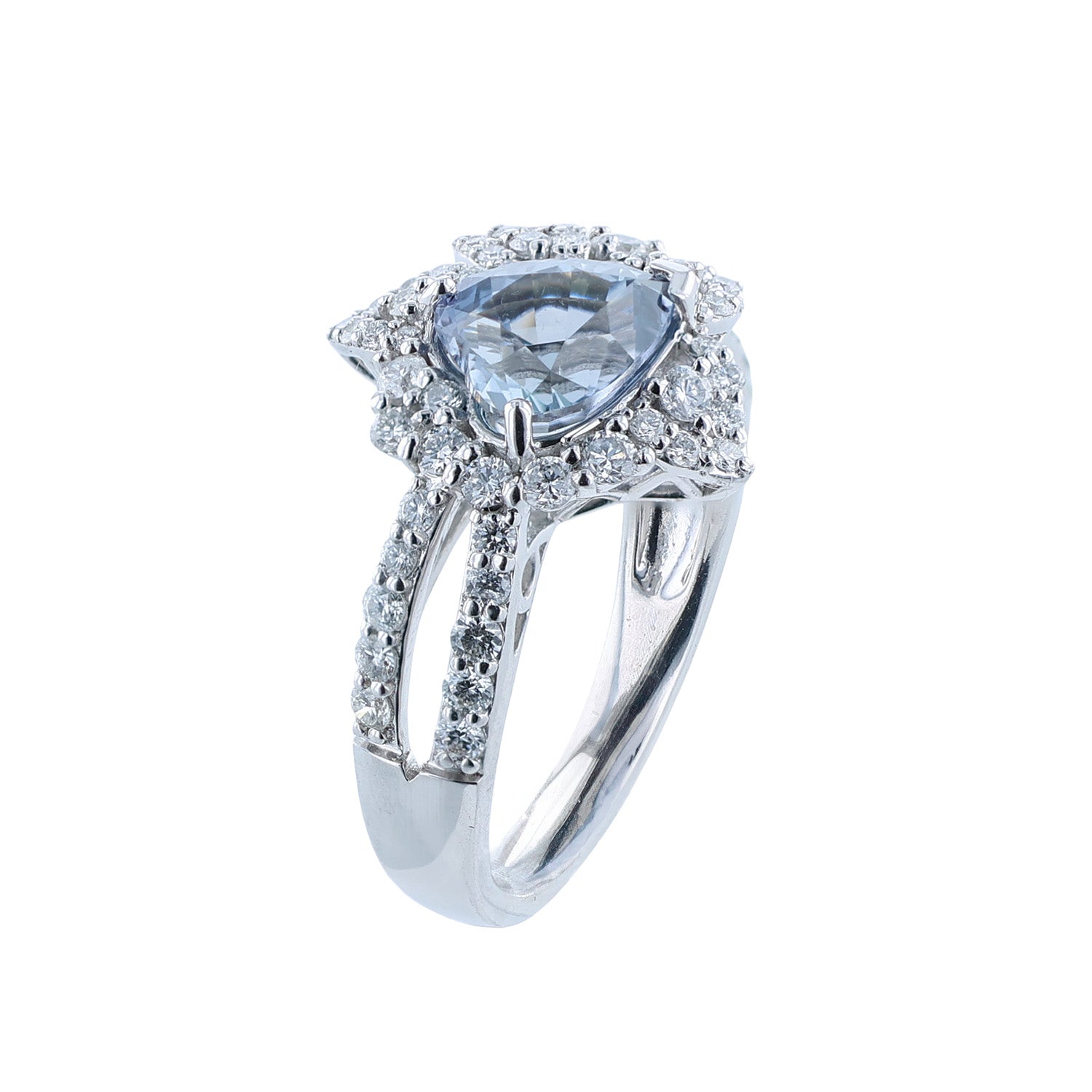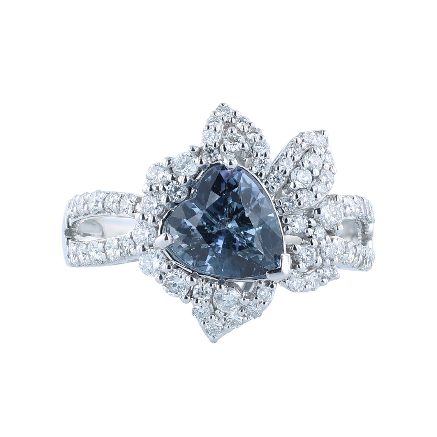 From the Bella Cosa Jewelers estate collection. This pre-owned sapphire and diamond ring features a no heat sapphire thats color changes from violetish blue to purple. The center stone is a 2.16 carat color-changing sapphire that has been GIA graded. The diamonds of this ring measure 0.75 carats and are F to G in color and VS1 to VS2 in clarity. This diamond and sapphire ring has been set in platinum and measures a size 7.