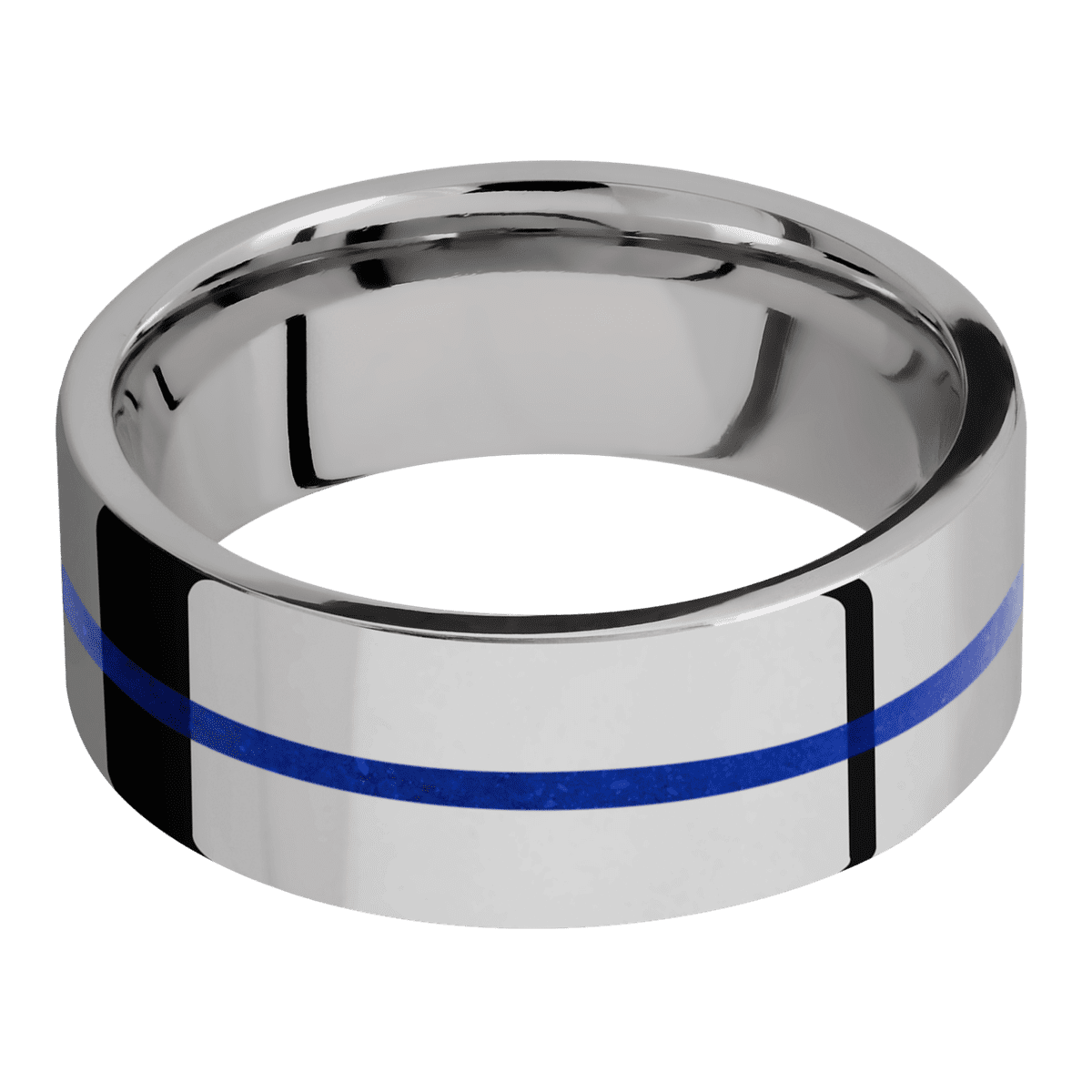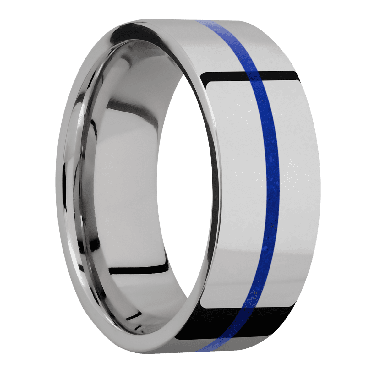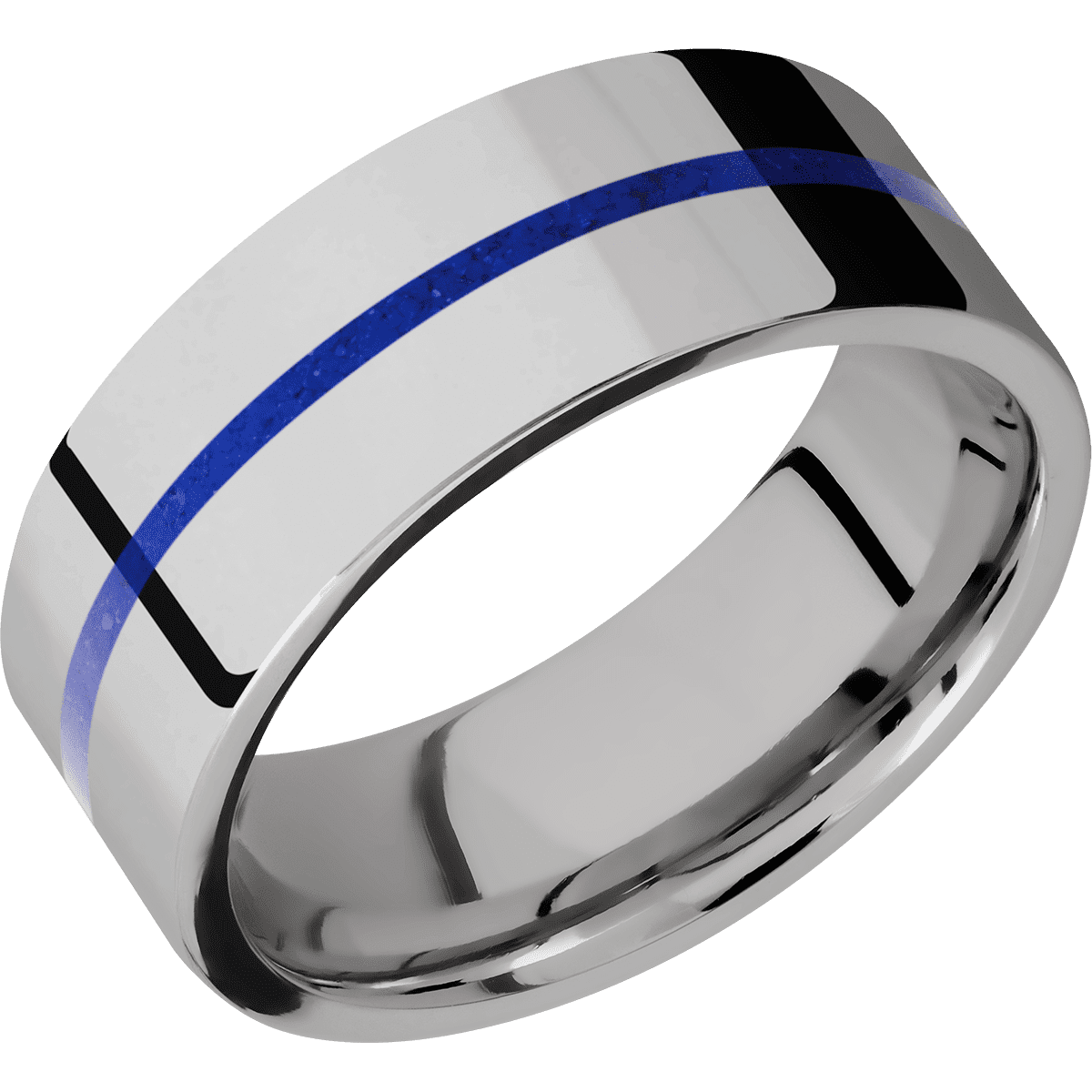 8 mm wide/Flat/Titanium band with one 1 mm Centered inlay of Lapis.
